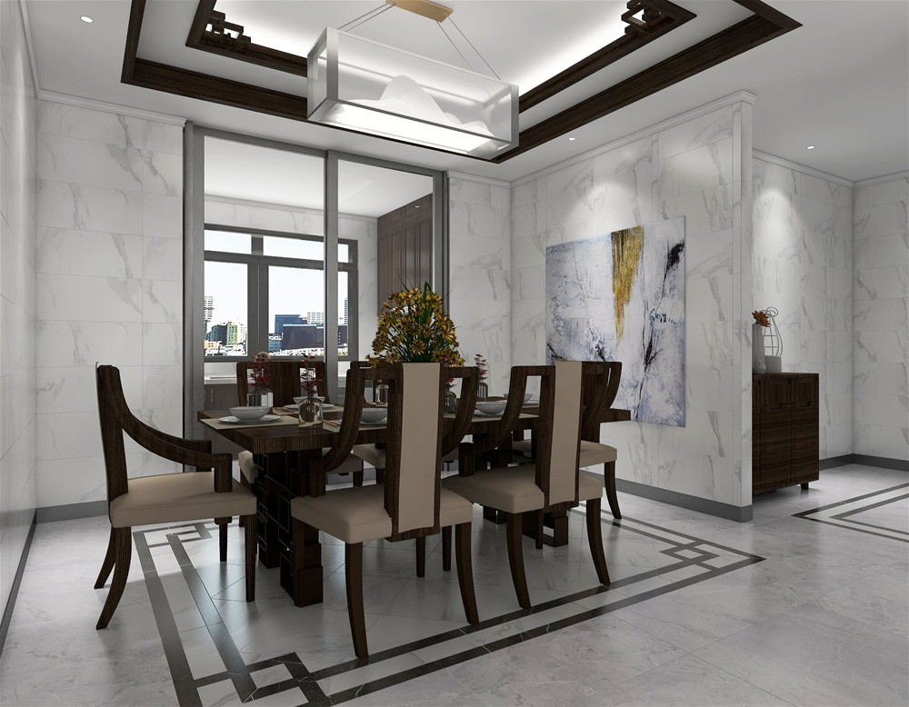 新中式餐廳地面主磚 緞光釉KFD880+地面拼花緞光釉KFD8806+墻面緞光釉KFD8801