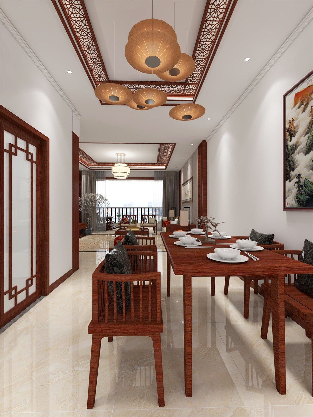 開放式的餐廳與客廳相連通,中間的走廊讓客廳、餐廳區域分明,餐廳矩形餐桌和復古的吊燈組合,天花是簡單的雕花,留住了中式韻味注入了新中式的創新元素。