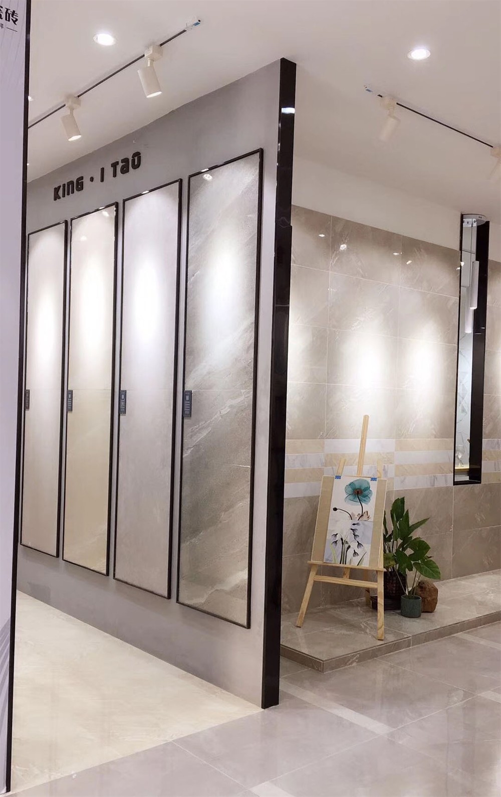 這是緞光釉卡拉卡白鋪貼的形象墻,白色的基調讓空間看起來寬敞明亮,灰色大紋理散發著優雅的氣息。
