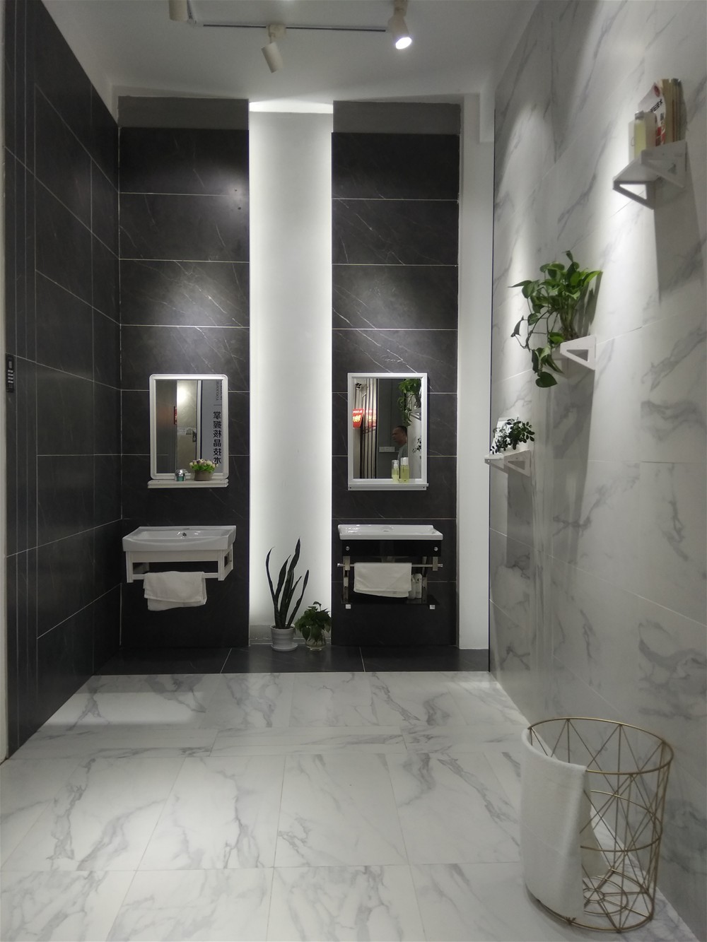 這是衛生間模擬間,瓷磚選用金艾陶噴墨瓷片,上墻下地都能鋪,顏色是今年流行的灰色調,一深一淺搭配出層次感,也不至于單調。這款瓷片也可作廚房用磚。