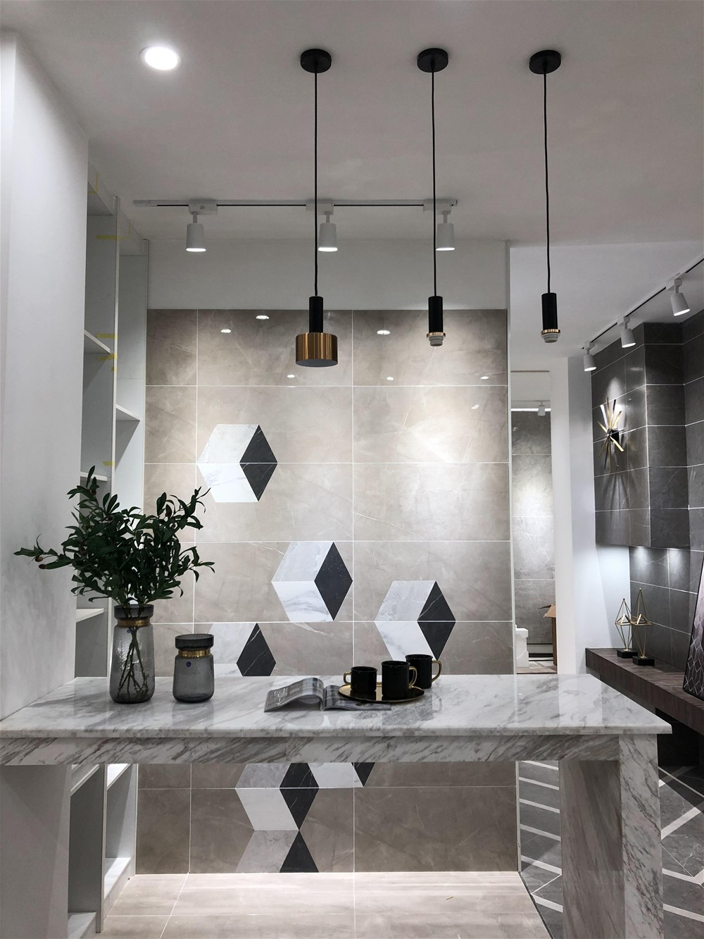 這是吧臺模擬間,由九面通體大理石和緞光釉不同規格、產品、顏色鋪貼的墻面,個性、時尚,搭配大理石吧臺和金屬軟裝,營造出輕奢的質感。