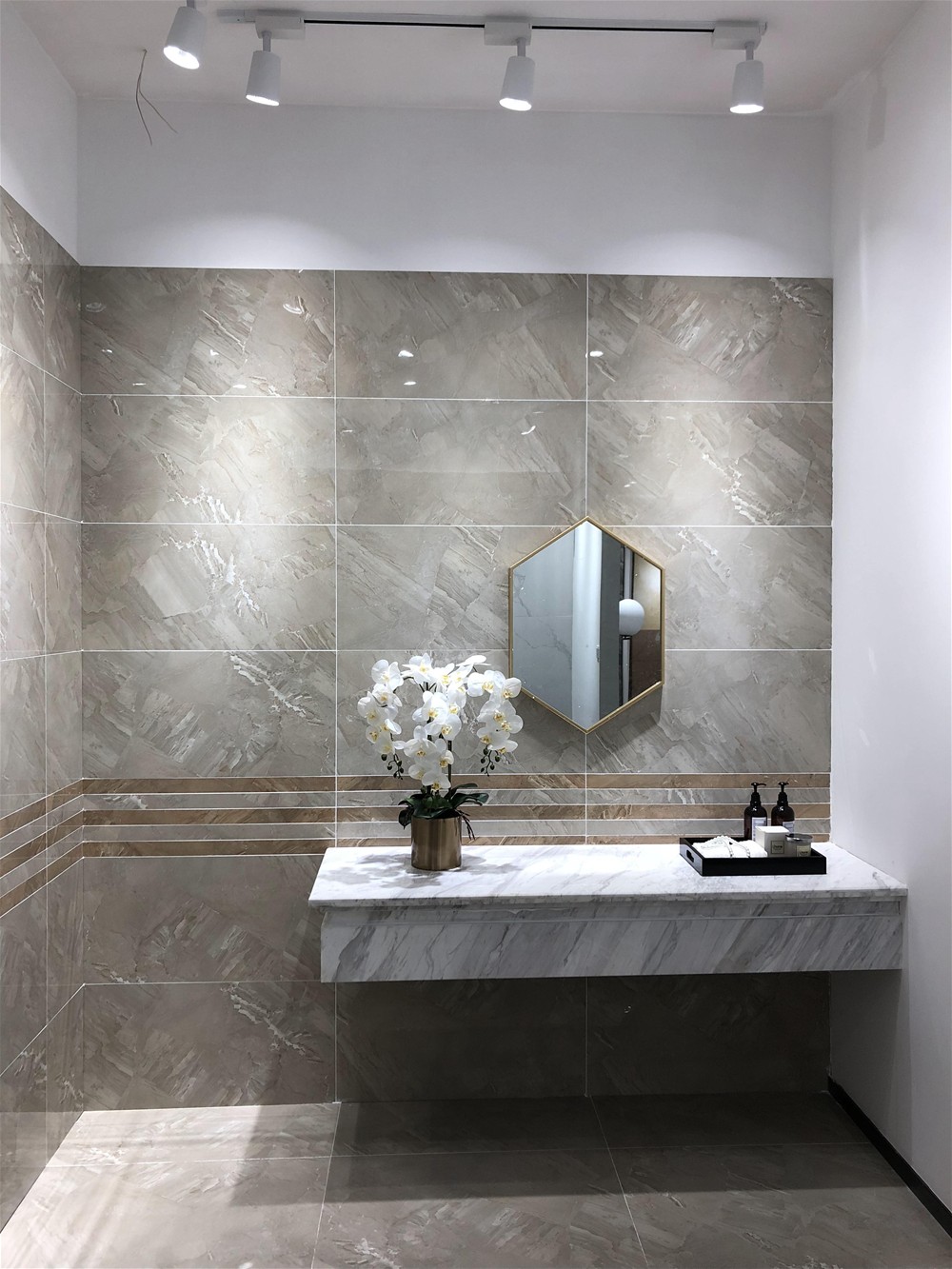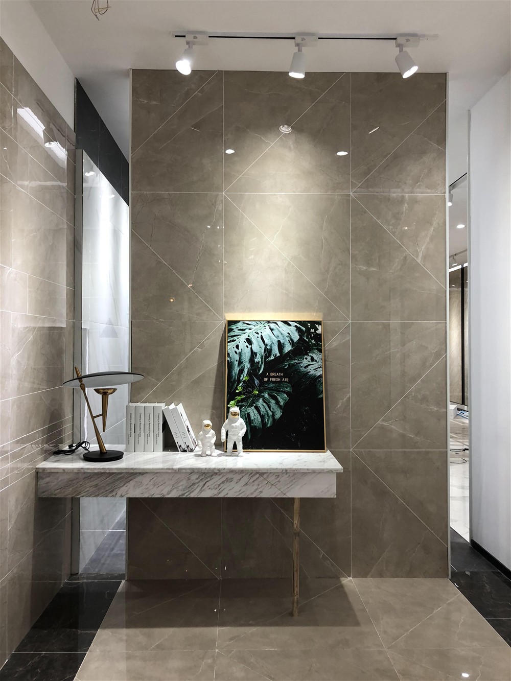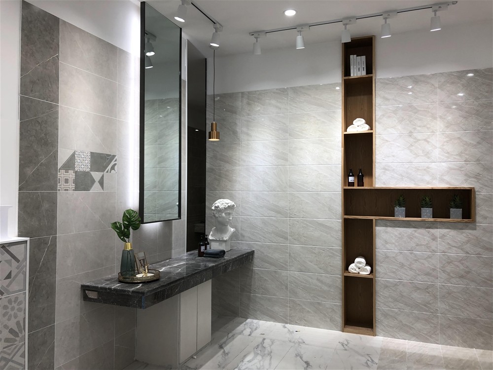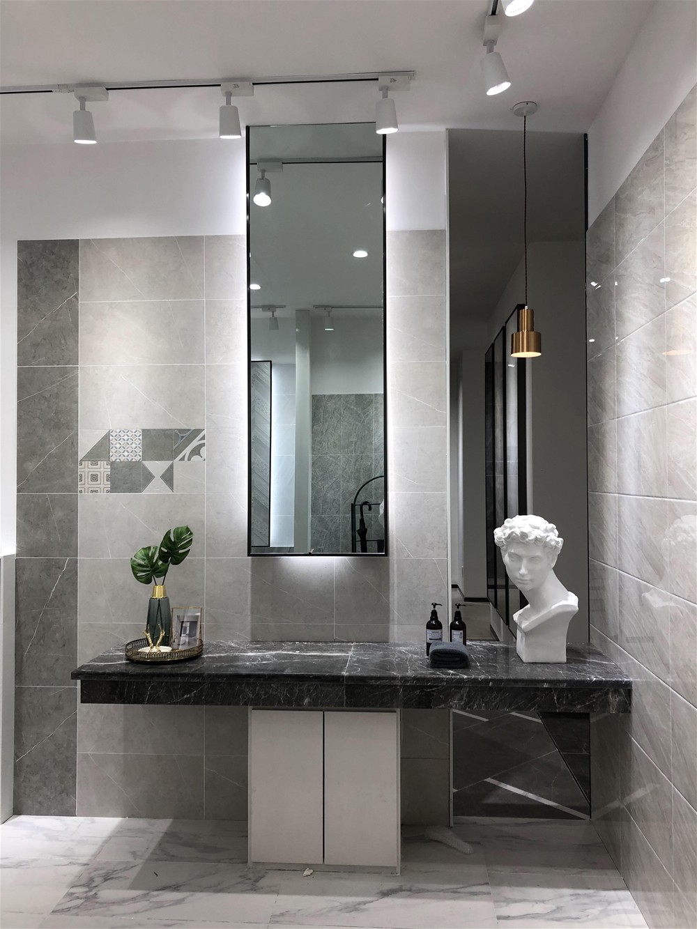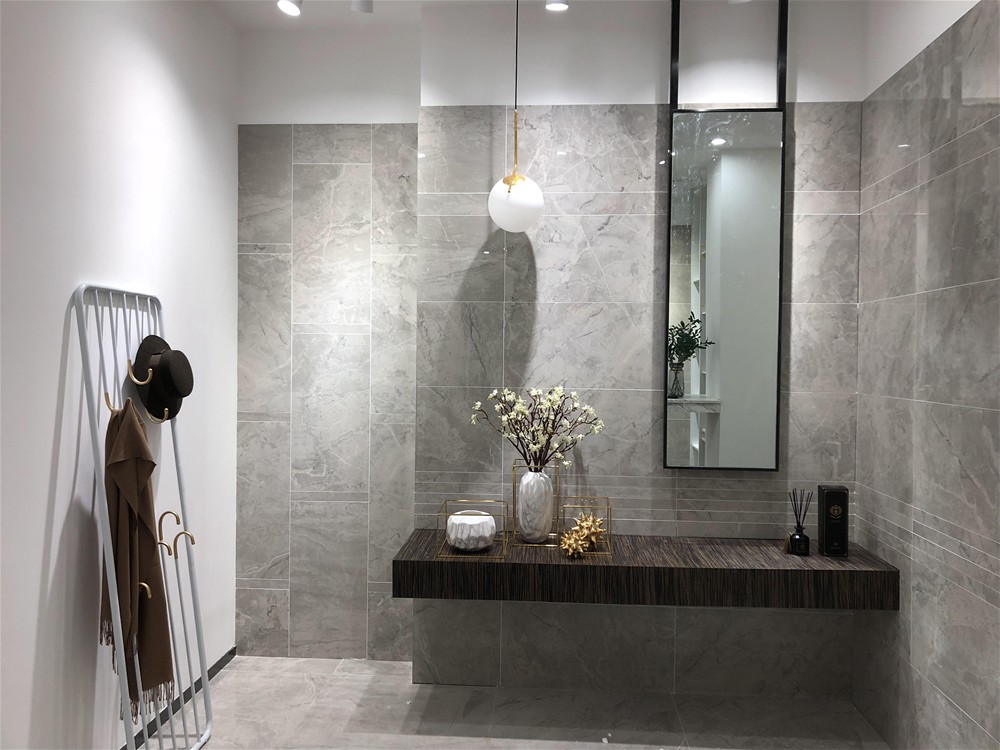 這是灰色調的衛生間模擬間,瓷磚選用通體大理石亮面磚,上墻下地都能鋪,現代簡約風和輕奢風都十分適用。