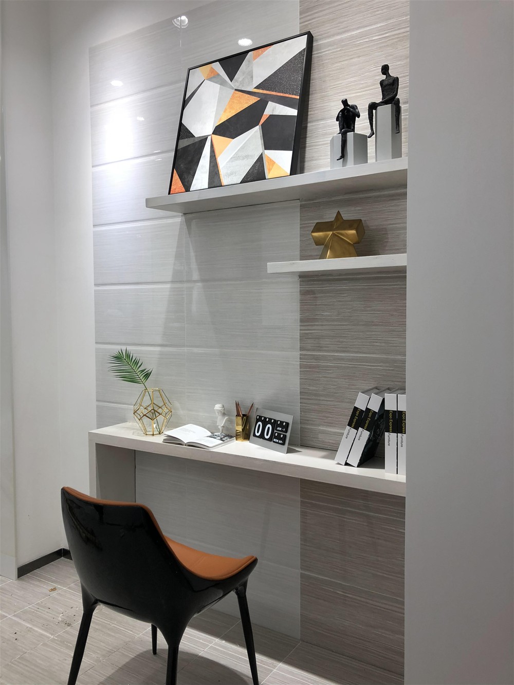 這是由噴墨瓷片鋪貼的書房墻面,亮面磚易于打理,磚面線條簡潔舒適。