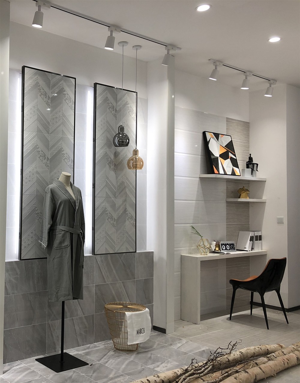 這是現代簡約風格衣帽間,前面三款由噴墨瓷片鋪貼而成,后面是由緞光釉鋪貼,沒有過多的切割加工,一深一淺,一素一彩簡單搭配,低成本講究實用性是現代簡約風遵循的宗旨。