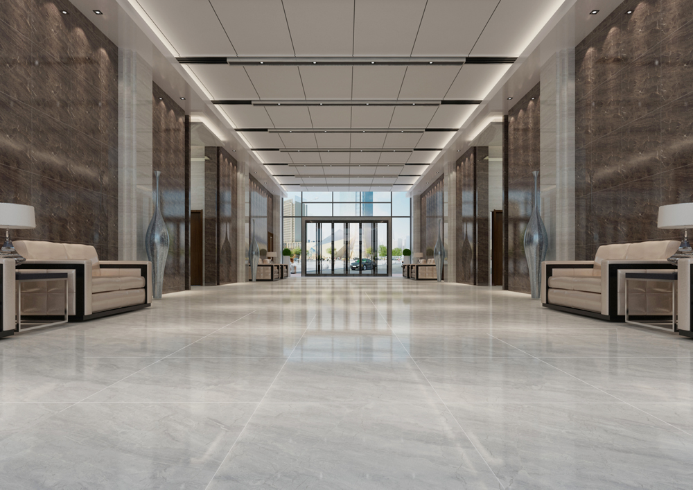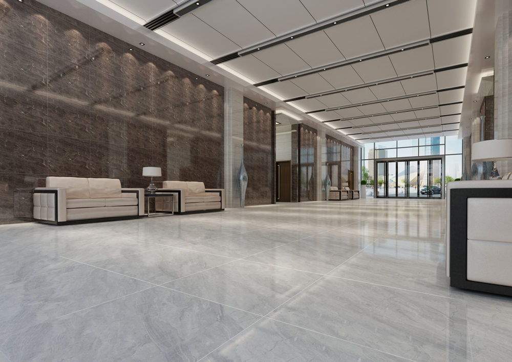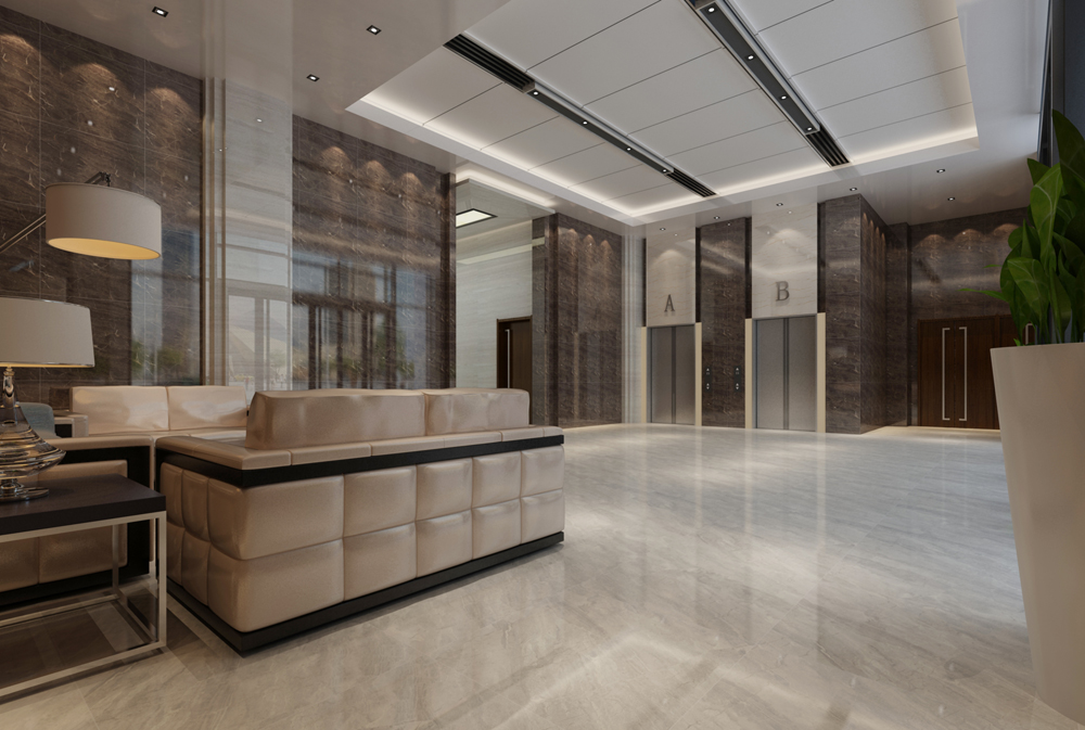 酒店休息區(KTA8301/KTB8110),同樣以通體大理石KTA8301/KTB8110鋪貼,一深一淺的搭配正好區分墻面和地面,但它們的紋理大致一樣,又很好地營造空間的和諧統一。沙發選用與地面接近的顏色,線條簡潔大氣,在休息區沒有流動的線條,設計師用意是想營造休息區的安靜氛圍。