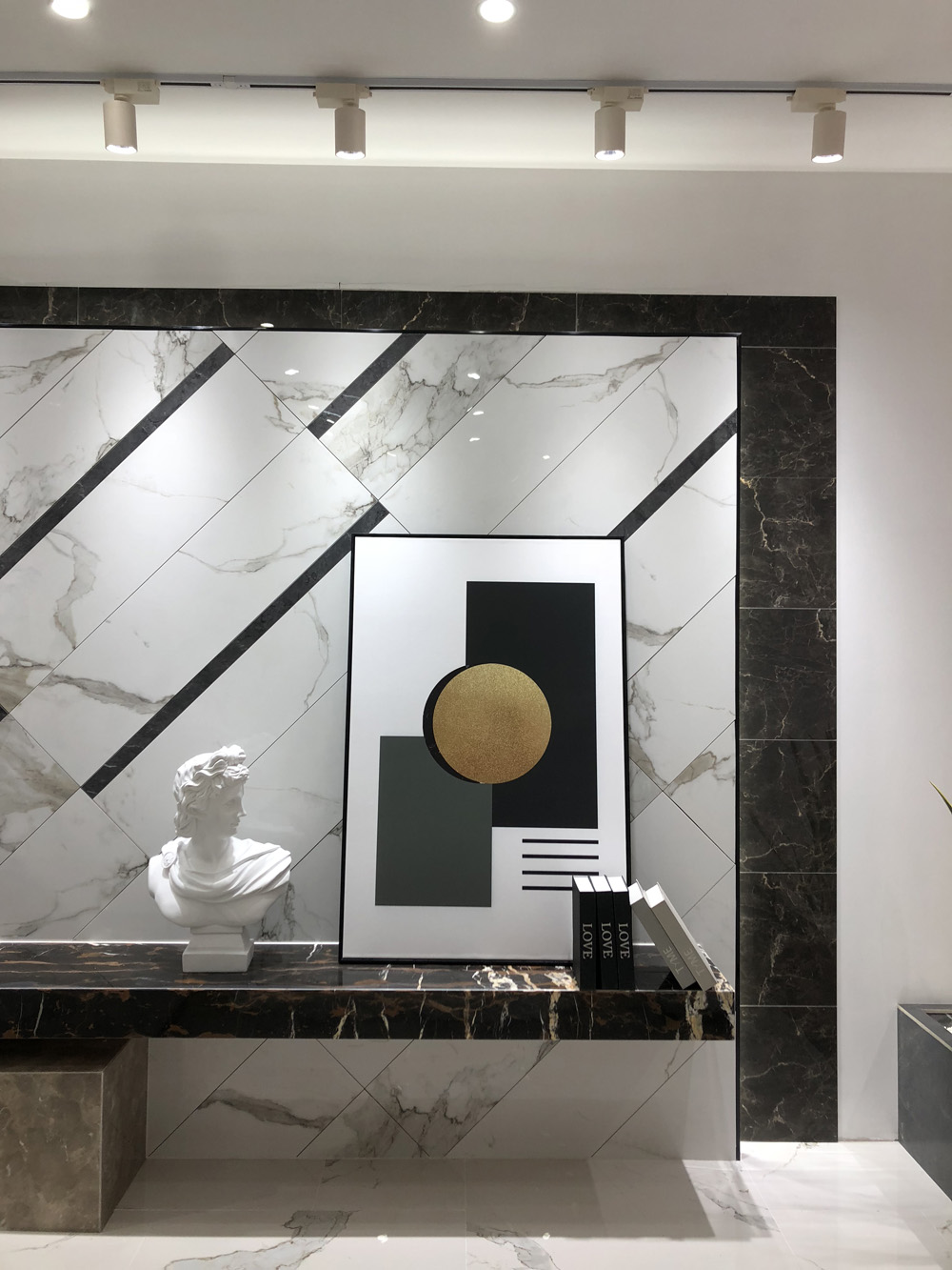 這是由通體大理石鋪貼的電視背景墻,一深一淺、一前一后營造視覺的沖擊,藝術(shù)與生活的結(jié)合。