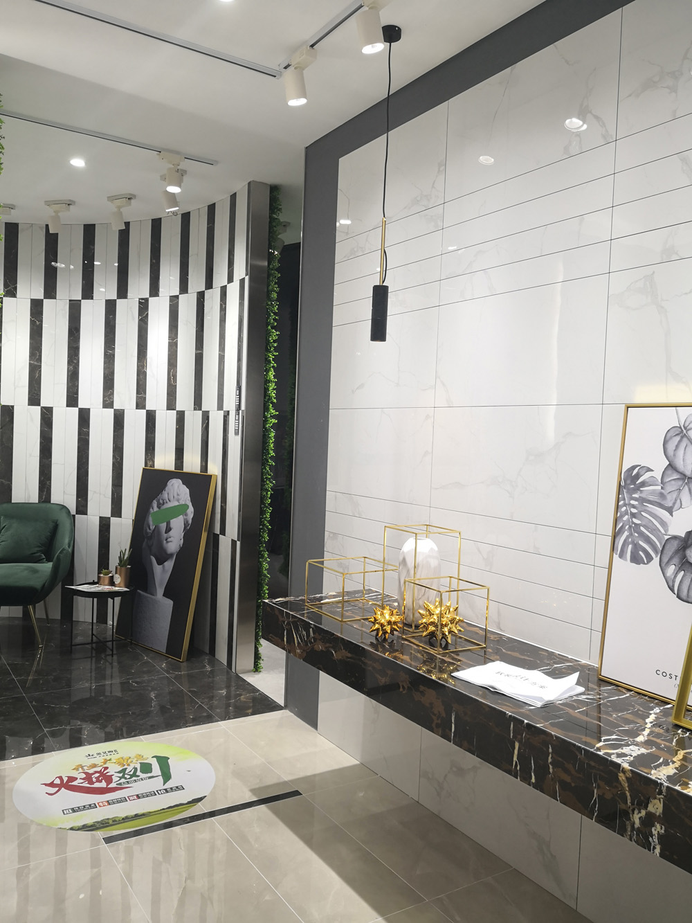 這是金艾陶浙江嵊州青春館的前臺,由灰色九面通體大理石鋪貼的背景墻,形象臺由緞光釉卡拉卡白鋪貼而成,可塑性非常強的一款產(chǎn)品。簡潔大氣的前臺延續(xù)了青春館的現(xiàn)代簡約風(fēng)格。