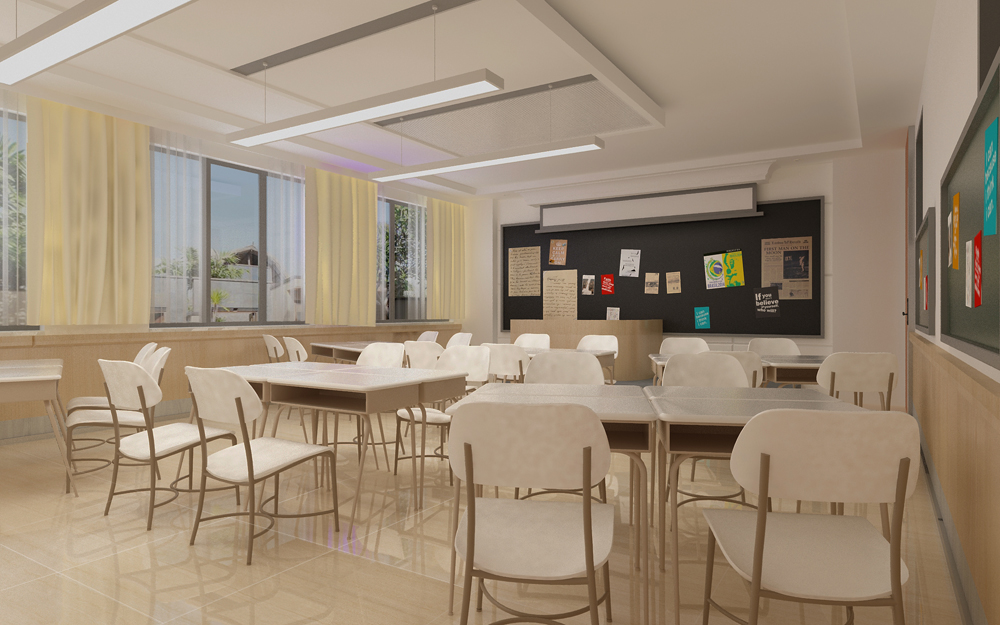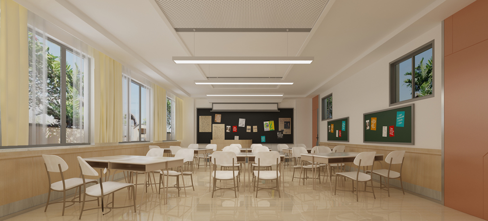 在大教室里,設計師要營造的是活躍的氛圍,椅子選用兩個顏色組合,錯開擺放不會顯得過于沉悶。綠色又是代表著生機的顏色,勃勃生機,欣欣向榮,對保護孩子視力也有很大幫助。