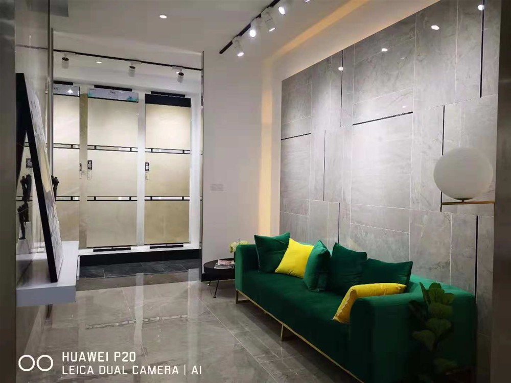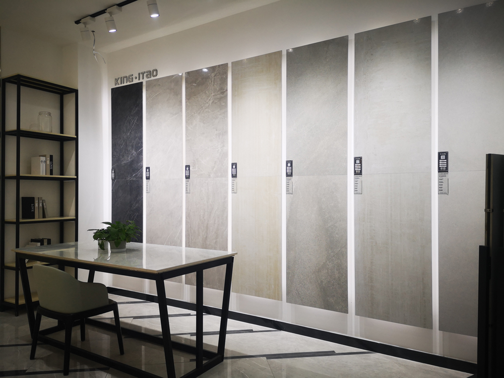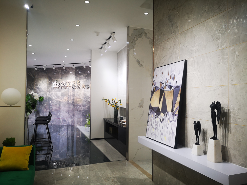 一進門是金艾陶logo的形象墻,大規格900*1800艾釉石KYP918005直鋪而成,地巖立體的畫面感,品牌:大氣、簡潔的形象表現得淋漓盡致。