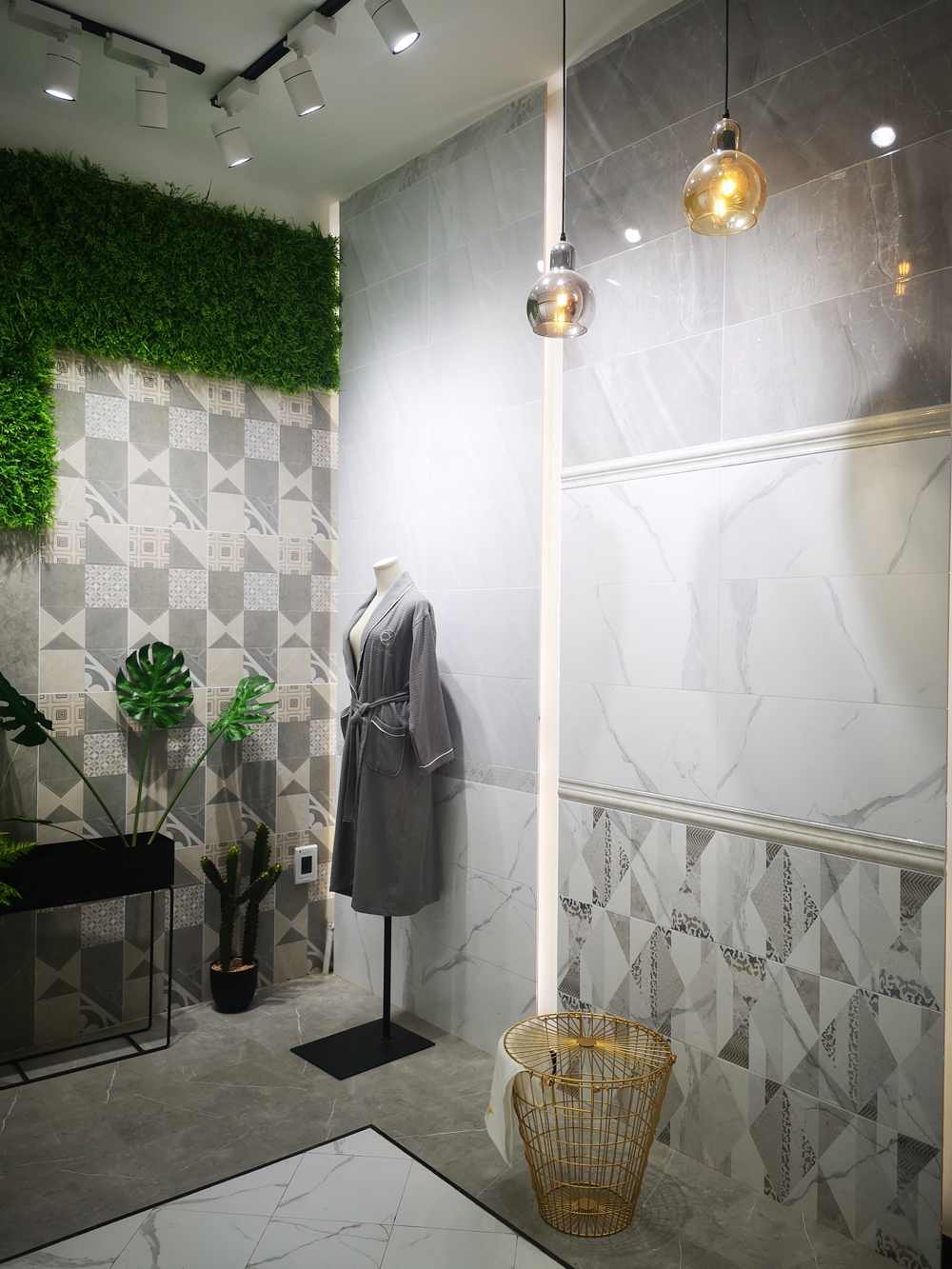 這是選材區,打豎的陳列方式射燈下的產品,直觀、整潔、大氣、很好地凸顯產品的紋理,推拉陳列方式主要針對噴墨瓷片,簡單一堵墻就能把噴墨瓷片的搭配、鋪貼、風格直觀呈現。