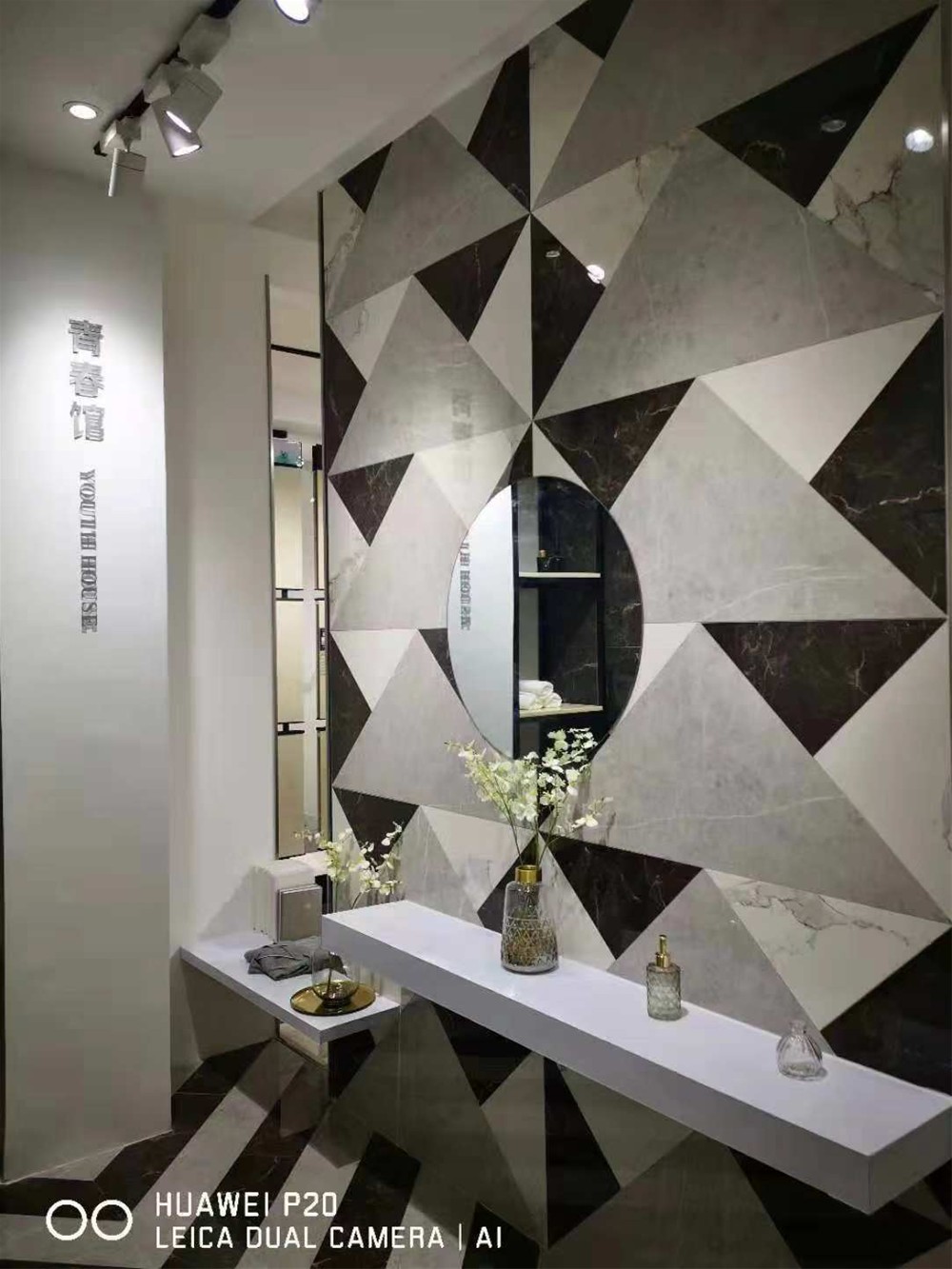 這是是由通體大理石KTA9817、KTA9818、KTA9819不同顏色不同規格三角形組合鋪貼的衛生間,打破傳統的衛生間鋪貼,搭配純白色的臺面,一繁一簡搭配不會產生審美疲勞。