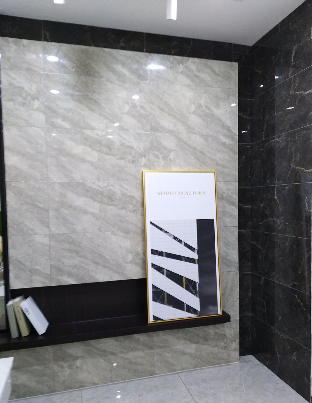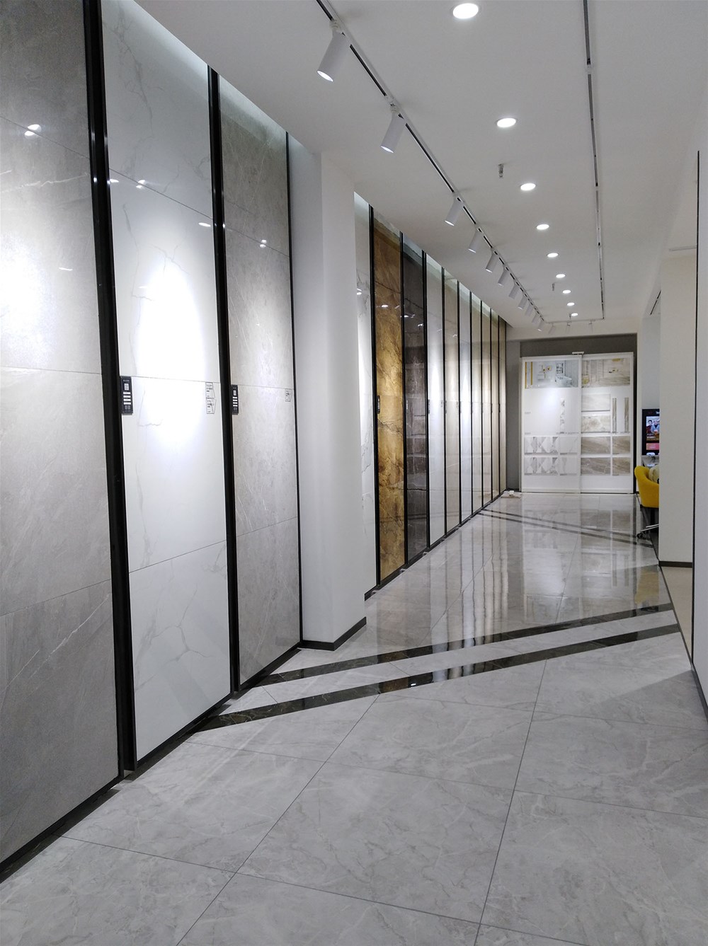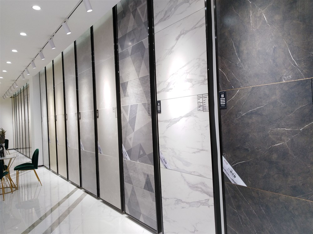 這邊走,這是我們的選材區(qū),規(guī)格、款式、風(fēng)格一應(yīng)俱全,通過射燈照射下的磚面紋理是不是清晰多了?如果您現(xiàn)在還不知道自己要選什么產(chǎn)品,看完我們的模擬間你或許就能找到方向了。