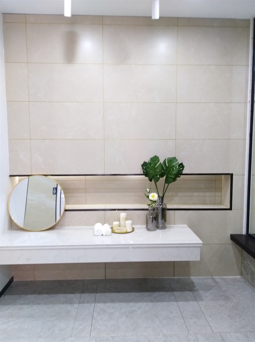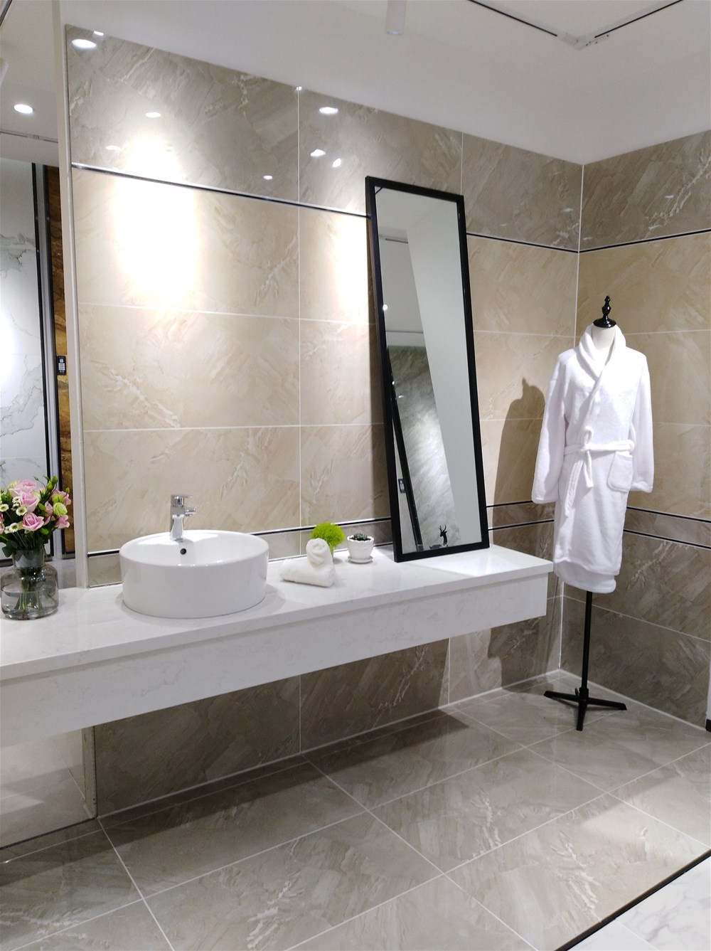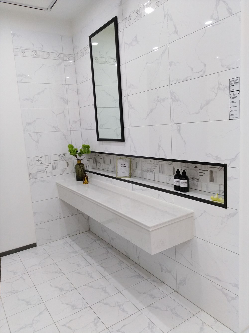 這邊走,這是我們的選材區(qū),規(guī)格、款式、風(fēng)格一應(yīng)俱全,通過射燈照射下的磚面紋理是不是清晰多了?如果您現(xiàn)在還不知道自己要選什么產(chǎn)品,看完我們的模擬間你或許就能找到方向了。