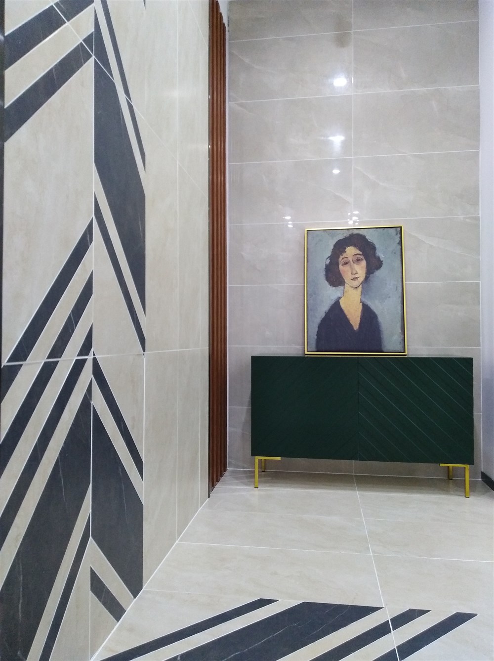 這是現(xiàn)代簡約風(fēng)格玄關(guān),正面墻由通體大理石KT9832凱羅地灰鋪貼,玉石的質(zhì)感溫潤細(xì)膩,側(cè)面墻則由15°緞光釉KFD8803泰坦米黃與KFD8808保級利亞灰切割鋪貼,正面正鋪與側(cè)面墻切割鋪貼,繁與簡結(jié)合,亮面與柔光面搭配,不會(huì)造成視覺疲勞又不至于太單調(diào)。