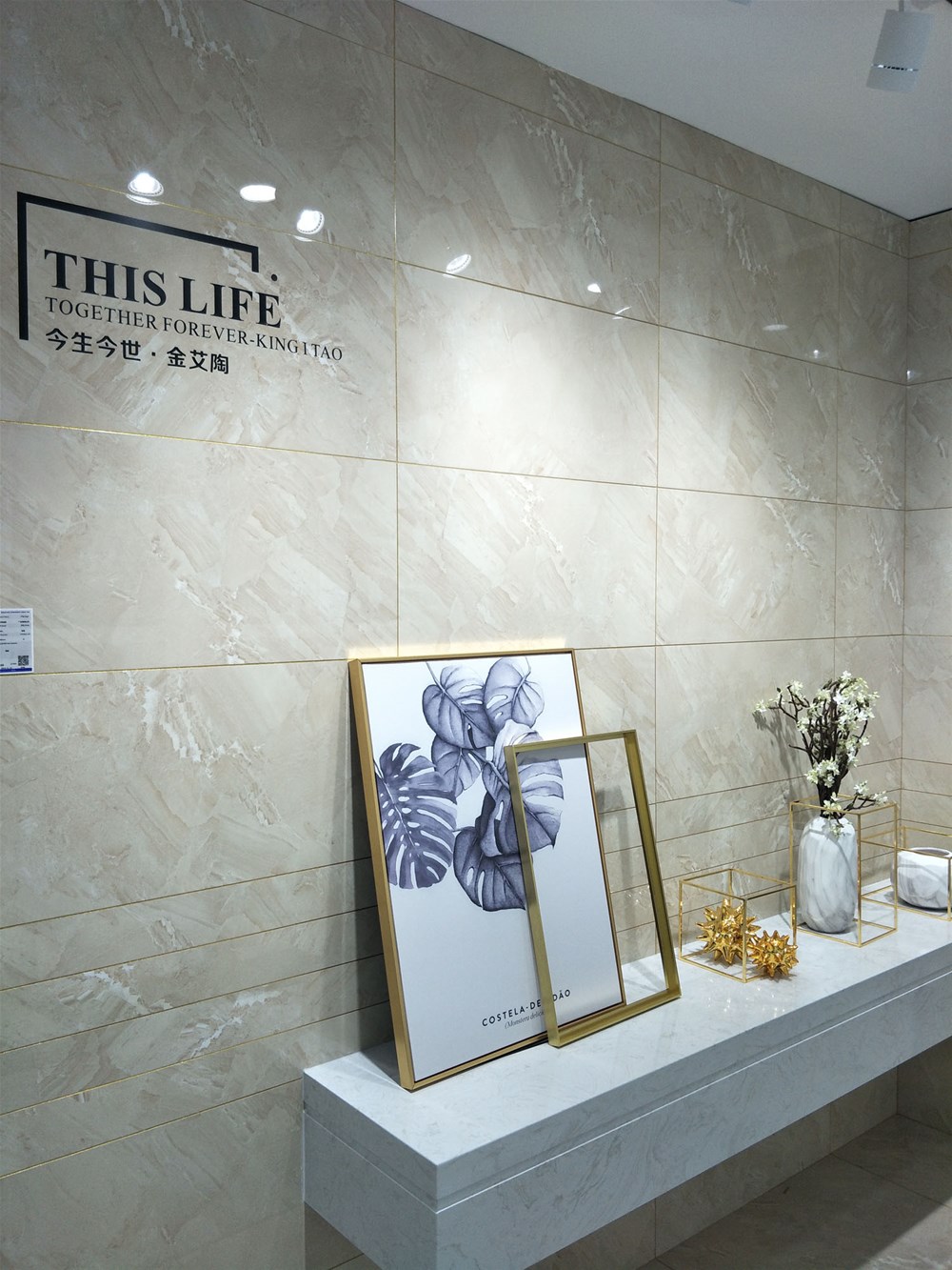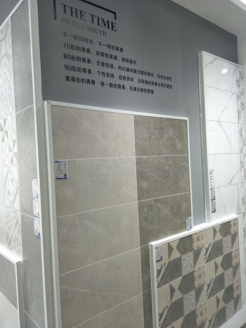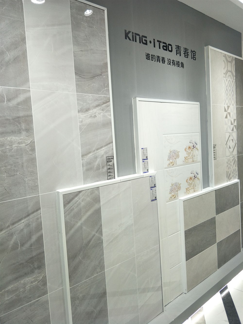 這是我們配套噴墨瓷片的展示墻,花片、小地磚、腰線、瓷片一應(yīng)俱全,廚房、衛(wèi)生間、陽臺等空間都適用,讓你完全省掉了搭配的麻煩。