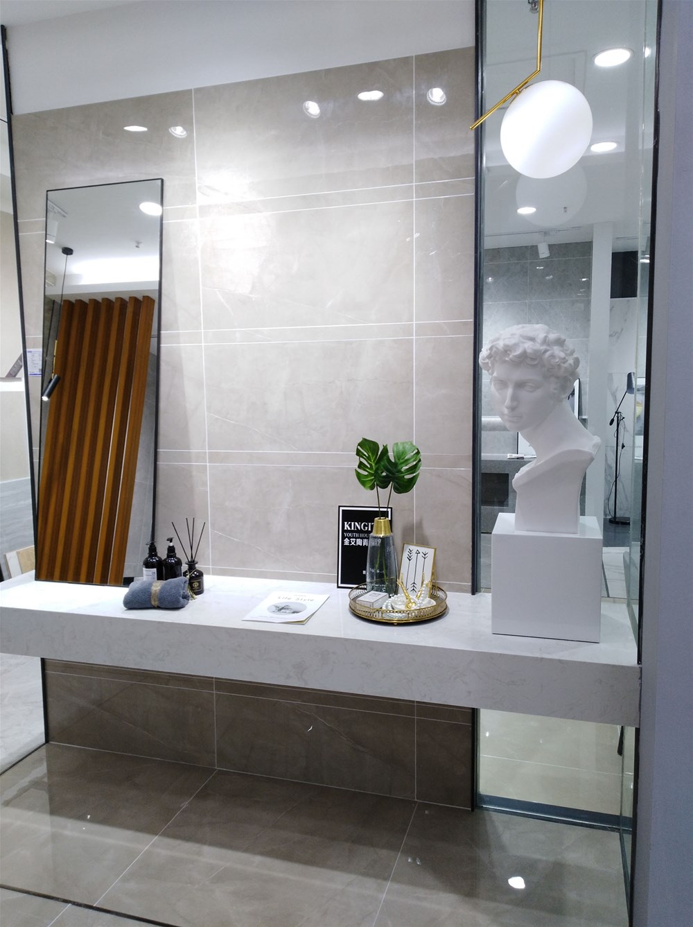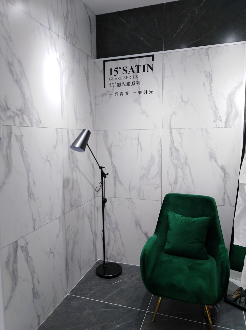 從外立面的櫥窗就能看到我們其中一個模擬間設(shè)計,這是由九面通體大理石KB9M61208卡門深灰單獨(dú)鋪貼,深灰色瓷磚搭配金色軟裝營造出神秘、沉穩(wěn)、輕奢的空間氛圍,這款瓷磚鋪貼客廳地面,電視背景墻等地方同樣適合。