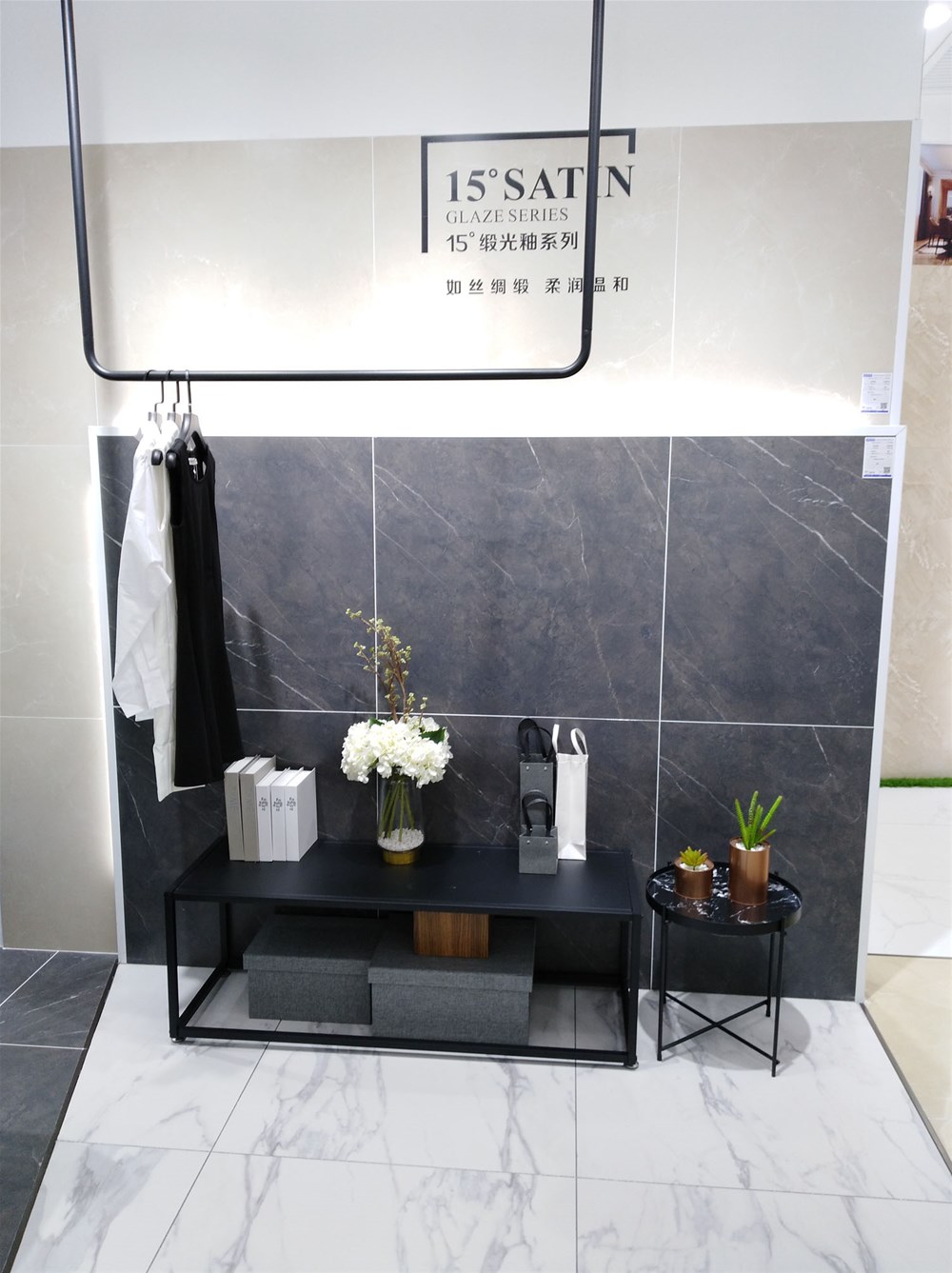 一路走下來不知道您有沒有發(fā)現(xiàn),我們灰色磚鋪貼的模擬間會比較多?灰色磚沉穩(wěn)、大氣,能營造安靜的空間氛圍,近兩年來深受年輕消費(fèi)者喜愛,您看,這是現(xiàn)代簡約服裝店的模擬間,如果在商場看到這樣設(shè)計的店面,您是不是也想進(jìn)去看看里邊的商品呢?