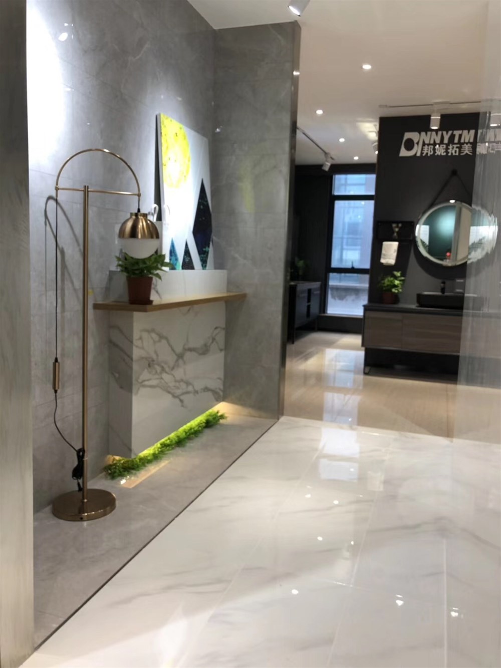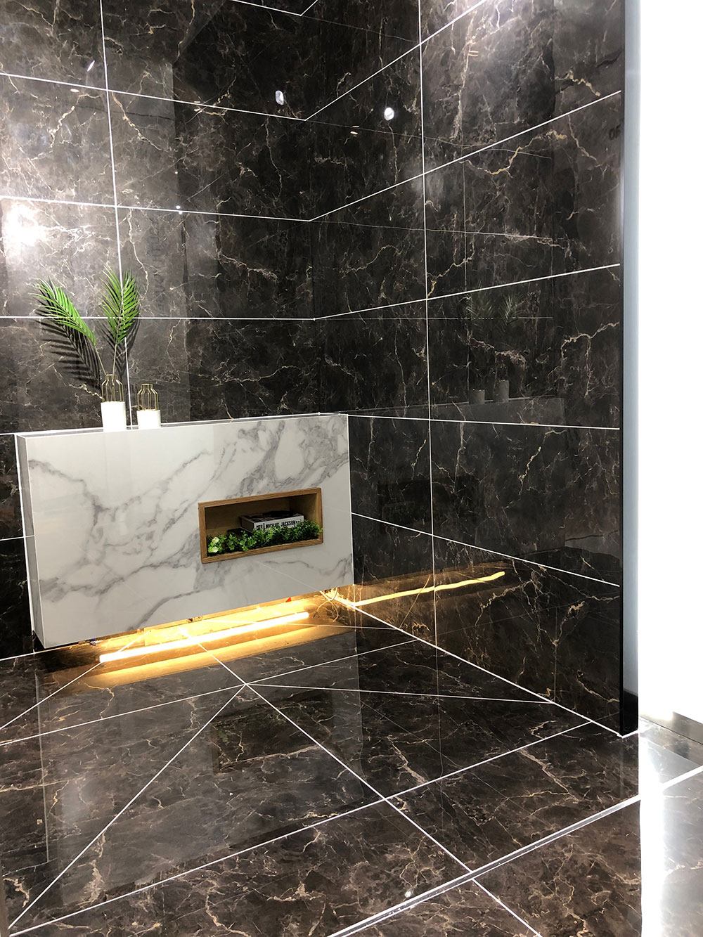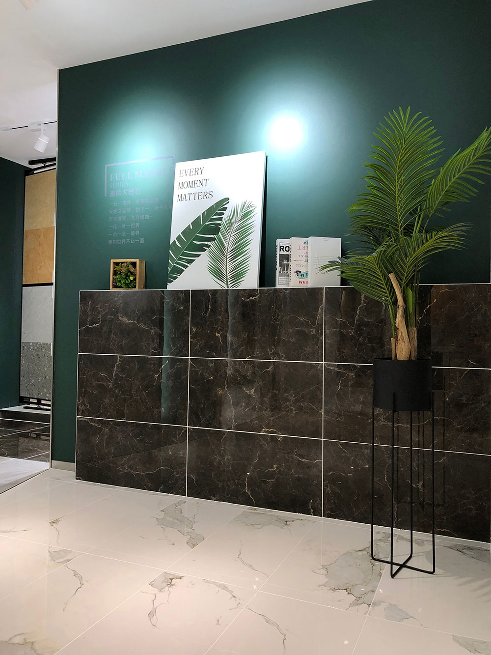 這是我們的前臺,背景墻由灰色通體大理石KA9M009羅馬布里卡通鋪,把木紋條作為空間的間隔,前臺選用白色鑲嵌銀色大理石紋,整個空間散發著簡潔優雅的氣息。凸顯簡約的品牌定位。您家地磚和背景墻同樣適合選用這款磚。