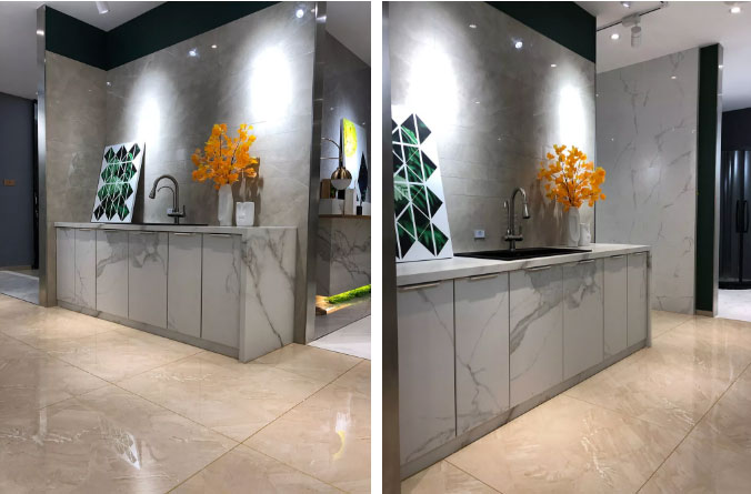 這是現代簡約風格廚房,墻面由艾釉石KYP8118通鋪,地面由KYP8069格蘭石通鋪,米黃色與淺灰色搭配形成對比,給人視覺上強烈的沖擊力。