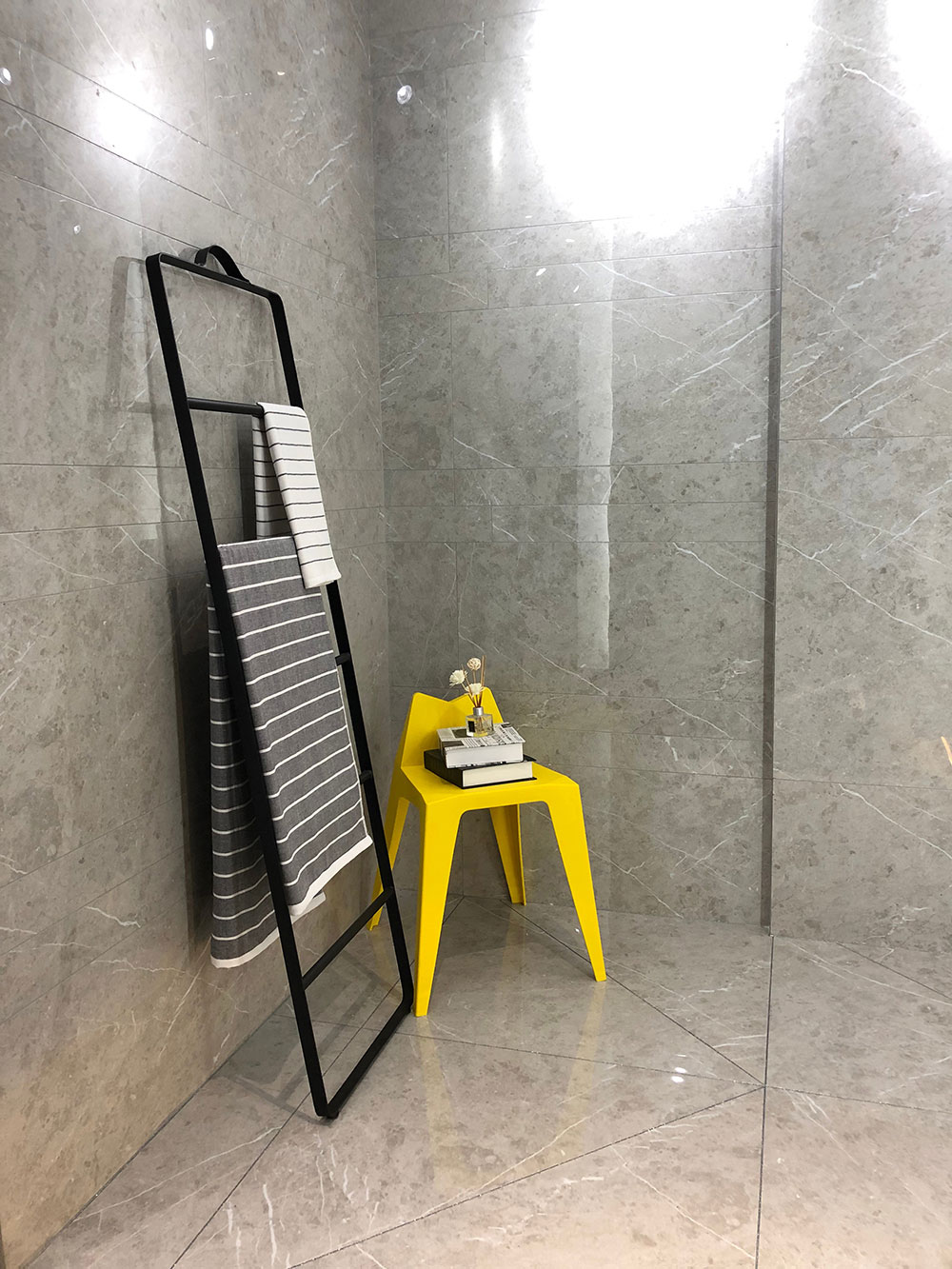 這是由通體大理石KTA9819卡門灰鋪貼的衣帽間,整個空間以灰色作為主色調,灰色是百搭色,軟裝選用黃色,墻面凹凸有致,營造視覺沖擊力,灰色作為近幾年的家裝主流色,運用于電視背景墻、全屋地面都是不錯的選擇。