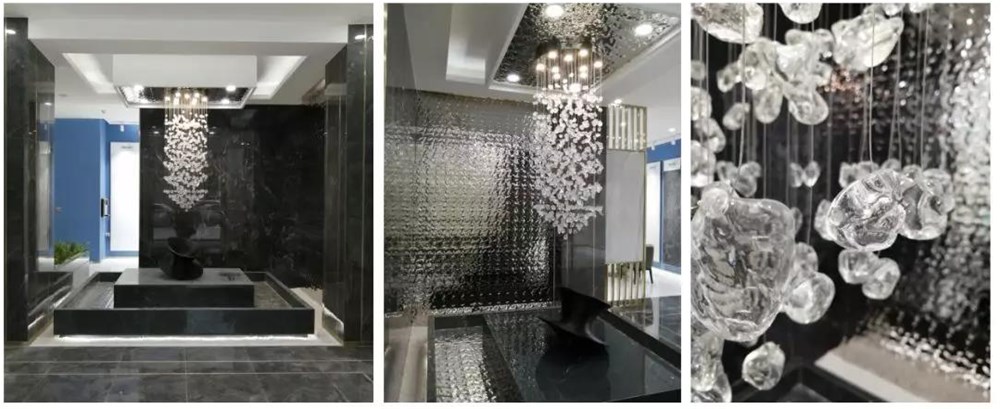 入口大堂入眼就是一個中央景觀形象區(qū),選用黑色的大理石搭配晶瑩剔透的瀑布水晶燈,璀璨奪目,高級感一下子提升上來