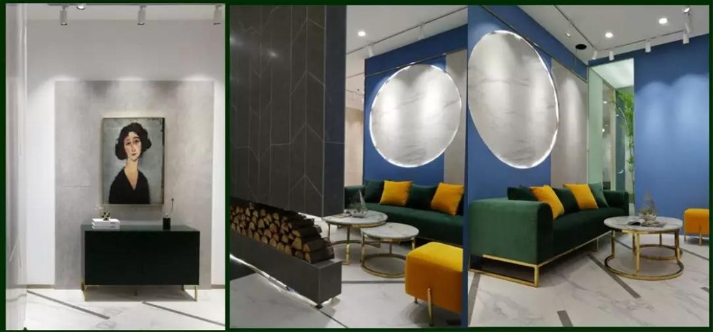 900*1800的大板以屏風的形式展現(xiàn),不但很巧妙的體現(xiàn)了大巖板系列產(chǎn)品的紋理和設(shè)計感,而且通過系列的屏風展示很巧妙的把大堂區(qū)域兩邊劃分為接待區(qū)和洽談區(qū),靜/動兩個區(qū)。