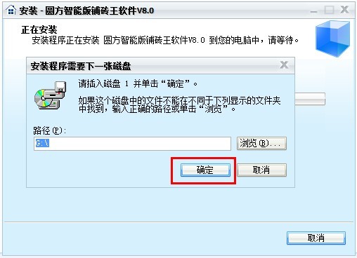 6、出現插入下一張盤的提示,請拿出A盤,放入B盤后,點擊“確定”繼續安裝,切記不要再點擊瀏覽更換安裝路徑,否則無法默認B盤文件