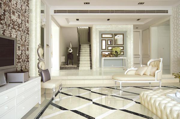 此客廳運用金艾陶大理石瓷磚金線莎安娜KYP8003瓷磚,具有玉石的色澤、花紋、質感,創造性地以搭配菱形點綴還原其靈性和內涵,盡顯客廳尊貴、雅致、時尚格調,堅持細節的極致完美,還原希有名貴大理石金線莎安娜的獨特紋理、變幻莫測的溫潤色澤。