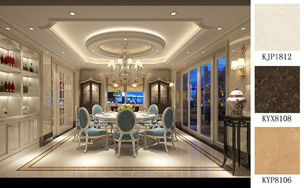 整個(gè)空間以淺色調(diào)為主,餐椅的一抹淺藍(lán)實(shí)現(xiàn)了整個(gè)空間色調(diào)的跳躍,更具韻味。地面主要鋪貼金剛釉瓷磚水晶玫瑰KJP1812、搭配大理石瓷磚金王啡KYX8108、大理石瓷磚金世紀(jì)米黃KYP8106,與整體格調(diào)相輔相成,自然舒適。天花造型方中有圓,精美的水晶吊燈鑲嵌其中,奢華大氣,雍容華貴!