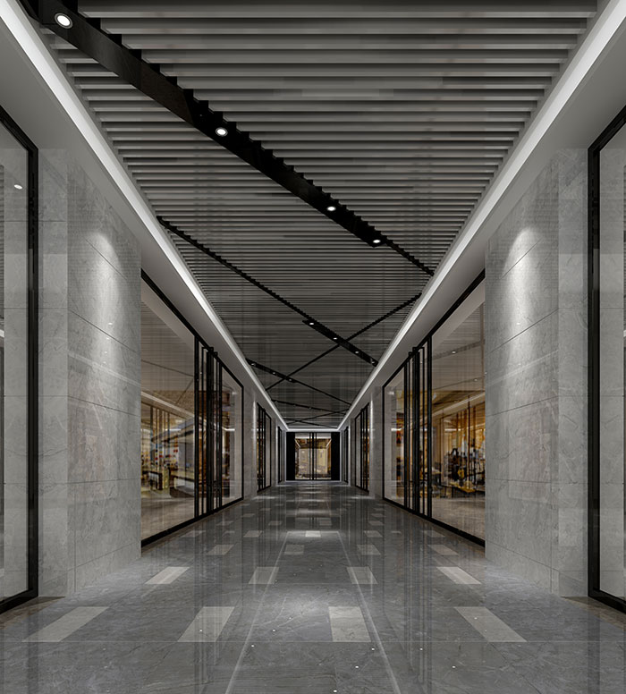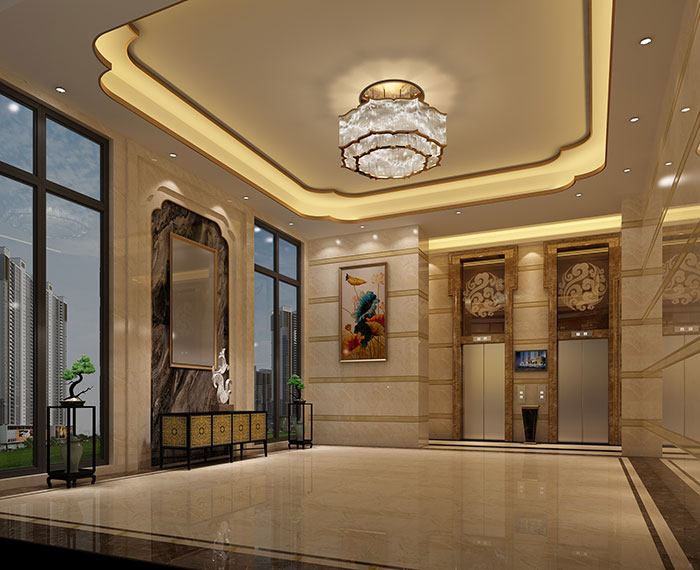 配合墻面的金色條框,設計師在吊頂設計中延續相同材質,使吊頂與墻面、地面的整體氛圍統一。