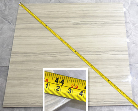 在測評現(xiàn)場,測試這款法國灰木紋尺寸是800mmX800mm的方形瓷磚,測評人員使用標準尺子量度,得出結果是長800mm*寬800mm,對角線為1131mm,做工與規(guī)格精準、分毫不差,可展露出金艾陶瓷磚,在生產研發(fā)上工藝嚴謹,尺寸規(guī)格把控一貫出色。