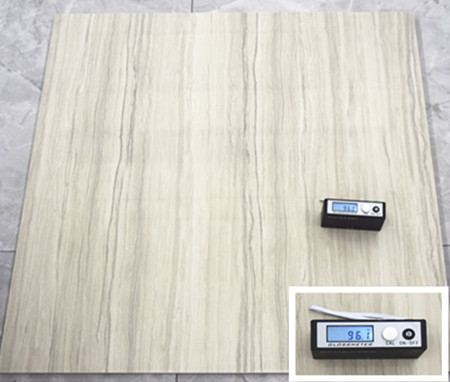 測評瓷磚必不可少的一項環(huán)節(jié)就是光澤度的測試,測評人員使用專業(yè)的光澤度儀,在瓷磚表面移動不同的位置測試,最后結果為多個位置光澤度的平均值。測試結果為96.1度,光澤度可以說是讓人意想不到的好。