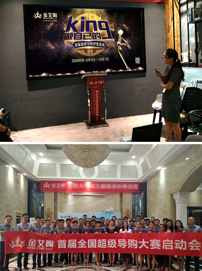 2017年8月3日上午,陶瓷一線品牌——金艾陶瓷磚銷售團隊7月PK賽暨金艾陶首屆超級導購評選大賽啟動儀式,年終國內外旅游啟動儀式;在金艾陶營銷總部順利舉行。金艾陶瓷磚品牌營銷總經理羅勝、網絡銷售部運營總監劉小良以及金艾陶瓷磚各部門主管參加了此次會議。