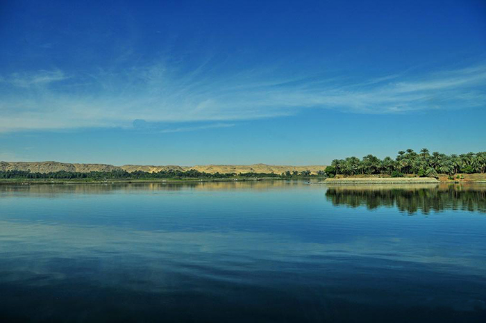 蜿蜒流淌的尼羅河,在黃色廣袤的沙漠中,猶如一條綠色的走廊,充滿(mǎn)著勃勃生機(jī)和無(wú)限希望。岸旁郁郁蔥蔥的灌木、連綿不絕的金黃色田野,在水中映出美麗的倒影,構(gòu)成一幅如詩(shī)如畫(huà)的美麗畫(huà)卷。碧草茵茵,蘆葦搖曳,使人想起“蒹葭蒼蒼,白露為霜,所謂伊人,在水一方”的意境,想象著在氤氳的水氣中,一位佳人正款款走來(lái)。