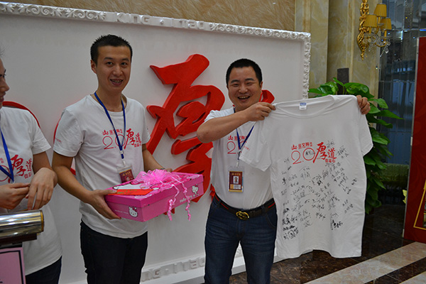營銷總監劉鴻瑞展示由金艾陶員工集體簽名的厚道衫