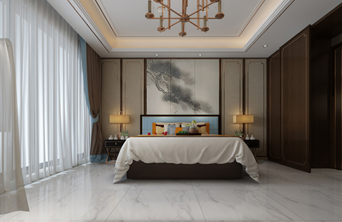 臥室家具采用實(shí)木紋,高貴大氣,設(shè)計(jì)成松子樣式的屏風(fēng)完美的體現(xiàn)了不可居無松的文人理念,配合深蘊(yùn)古風(fēng)的燈具,更顯古典。白色系落地窗簾與地磚相得益彰,整個(gè)臥室透著一絲絲涼意。