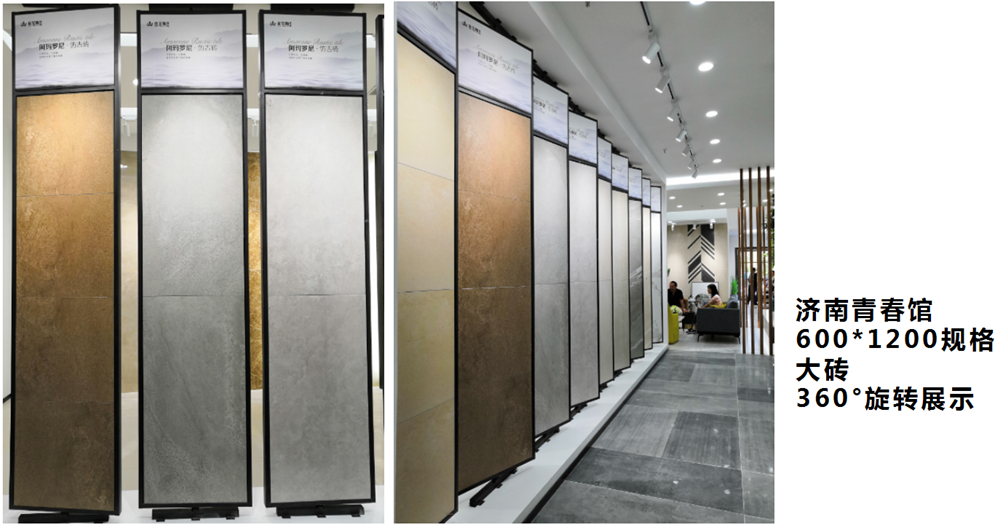大規格產品在終端青春館展示,設計師考慮的要點是要消費者能直觀感受到產品的豐富紋理、質感、色彩,從而推動終端銷售,這些要點我們的設計師都考慮周到了,雙層360°立體展示,燈光采用燈槽和射燈,照射出產品逼真、自然、大氣的紋理。