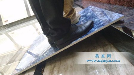 把瓷磚懸空架好,人站在瓷磚上,如果瓷磚基本上沒有破損或開裂,說明瓷磚的承重力非常好。較差的瓷磚容易斷開或開裂,不能承受較重的重量。放置在45度斜角面上承受2個成年人的體重都沒有絲毫影響,說明其抗壓能力非一般的好,安全性能高。